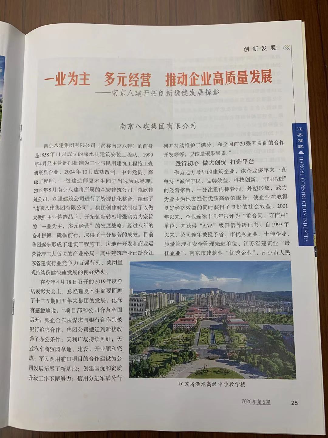 《一業(yè)為主 多元經(jīng)營(yíng) 推動(dòng)企業(yè)高質(zhì)量發(fā)展》發(fā)表在2020年6月《江蘇建筑業(yè)》雜志上。 -